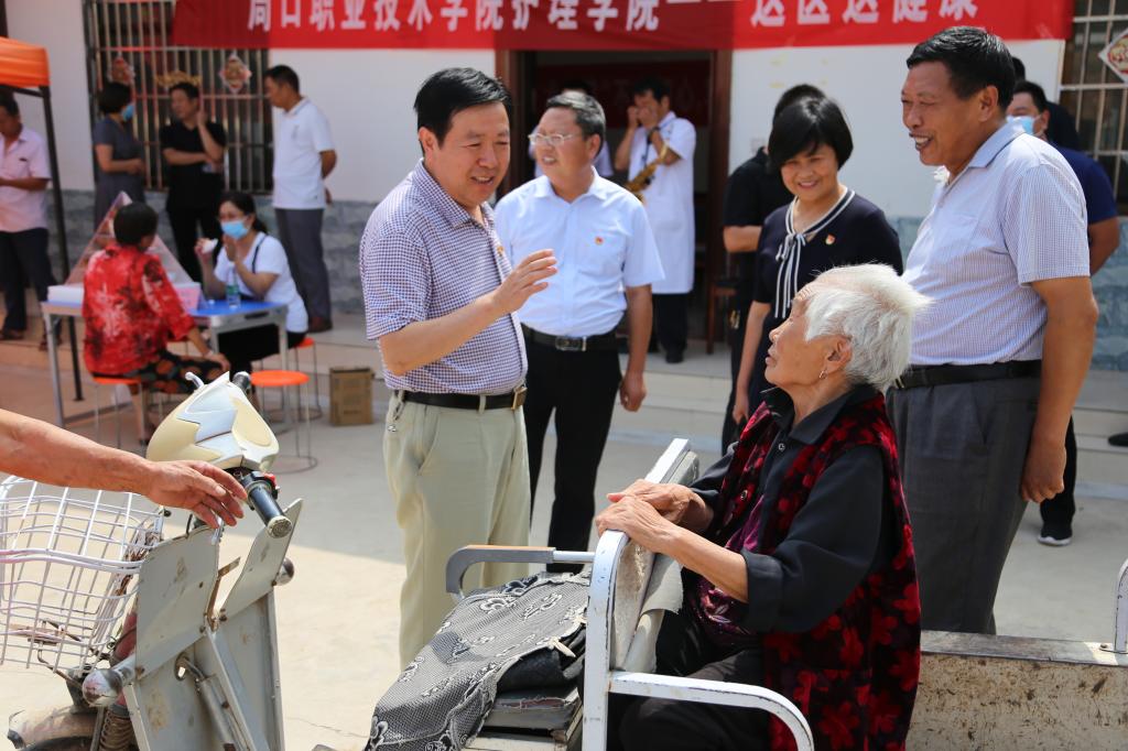 为切实解决贫困群众看病难问题,充分发挥我校在医疗卫生方面的专业和医疗优势,提高贫困人群健康水平。7月4日上午,校党委书记刘士欣、校长李清臣、党委副书记赵振然、副校长李庶泉、纪委书记唐永宾带领校党政办、组织统战部、宣传部、计财处、后勤处、附属医院、护理学院等部门负责同志及护理学院党员志愿者专程赴我校对口帮扶的沈丘县新安集镇三大夫营村开展周口职业技术学院“不忘初心、牢记使命”主题党日暨党员送医下乡,助推健康扶贫活动。