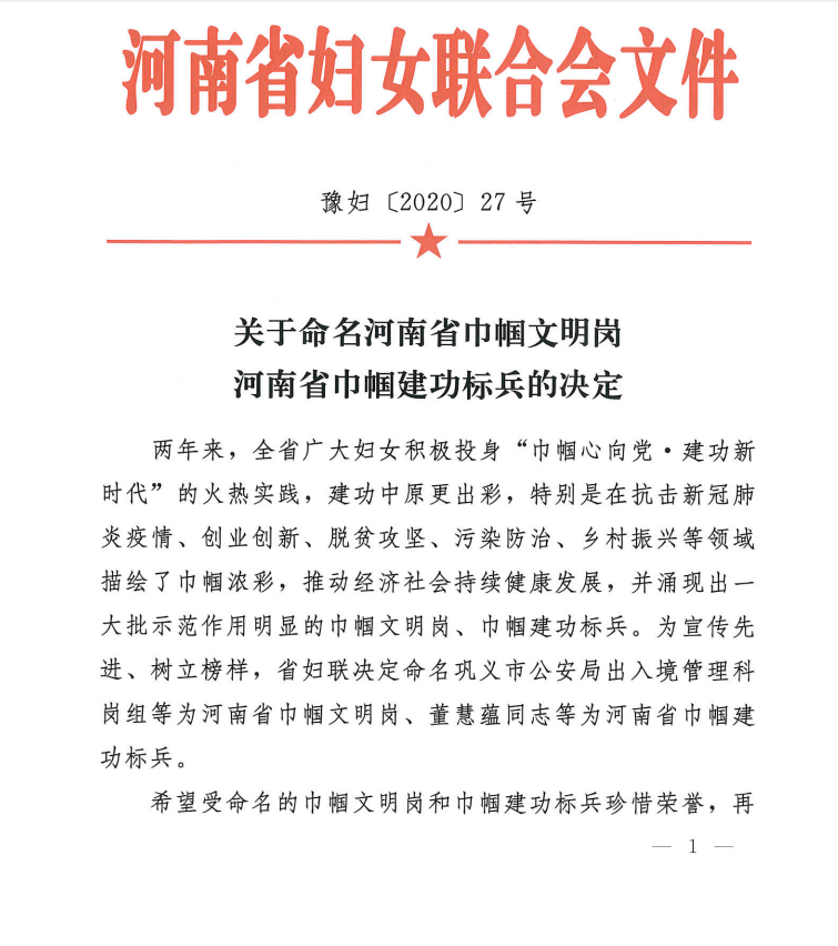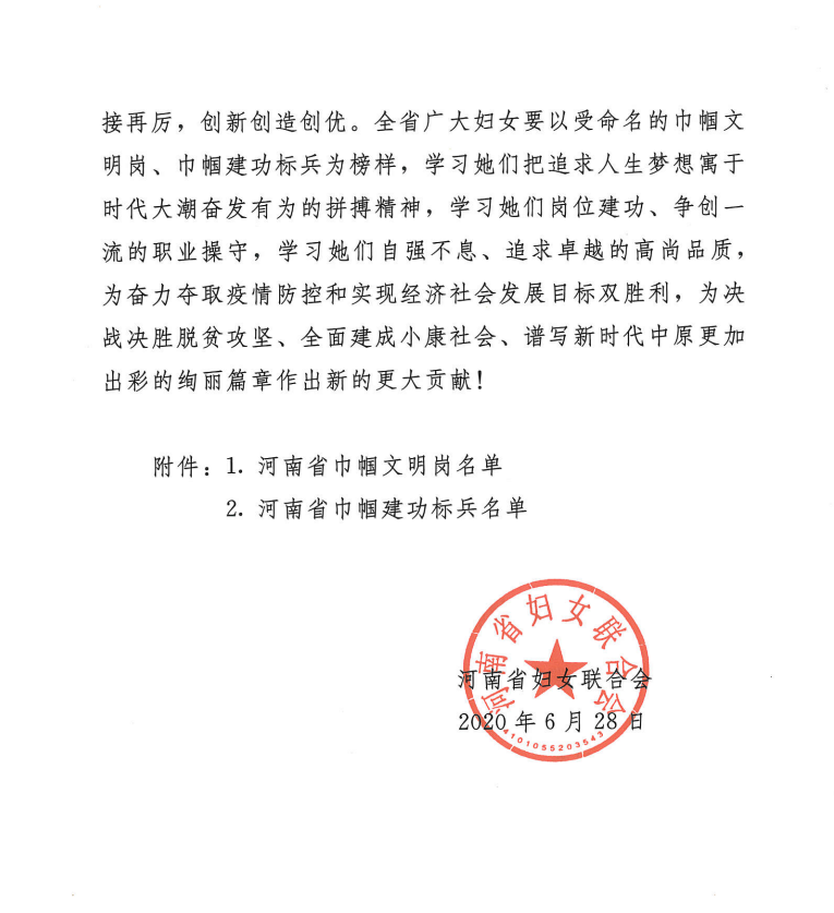 日前,从河南省妇女联合会传来喜讯,我校妇联被评选为“河南省巾帼文明岗”称号。据悉,此次评选的“河南省巾帼文明岗”“河南省巾帼建功标兵”是两年来,全省广大妇女积极投身“巾帼心向党 建功新时代”的火热实践,特别是在抗击新冠肺炎疫情、创业创新、脱贫攻坚、污染防止、乡村振兴等领域中涌现出的一批示范作用明显的巾帼英雄,她们描绘了巾帼浓彩,推动了经济社会持续健康发展。