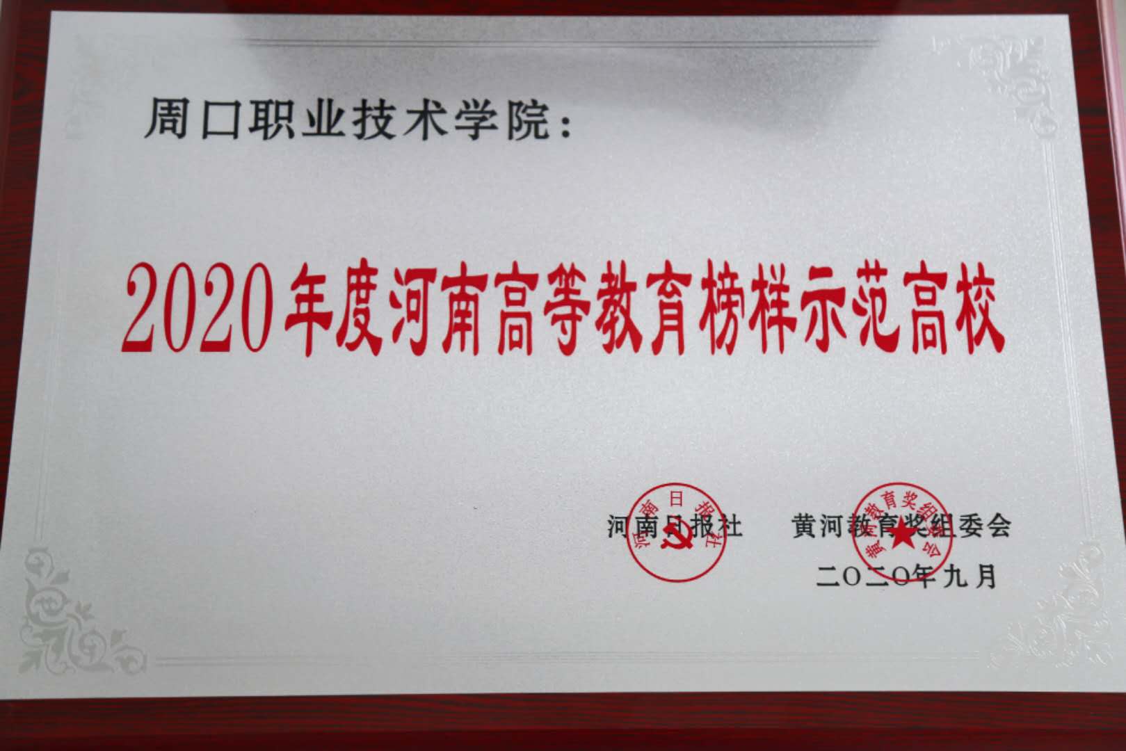 9月22日下午,由河南日报社主办的“第十一届河南高等教育品牌竞争力高端研讨会”暨“黄河教育奖”颁奖典礼在郑州召开。我校喜获“2020年度河南高等教育榜样示范高校”称号并出席本次研讨会,包括郑州大学、河南大学、黄河水利职业技术学院等全省80多所大中专院校的近200多名嘉宾参加了本次会议。此次研讨会以高校“高质量与创新驱动”为主题。