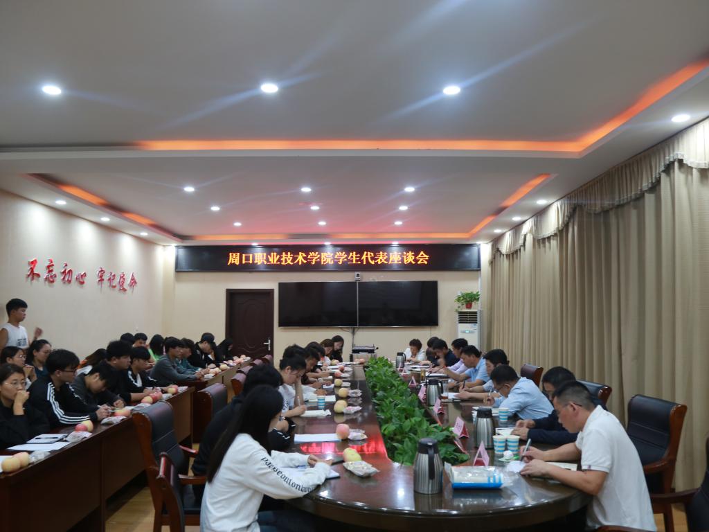 许永安对参加座谈的学生代表表示热烈欢迎和感谢,希望同学们从“周职给了我什么、我对周职能做什么、对学校有什么建议”等方面畅所欲言,表达自己内心真实的想法。来自青海的文教学院19级学生曲别林更首先发言,他结合自己在周职的学习实践经历,从抗疫故事到校园活动,表达了周职在平台型文化建设和艺术人才培养等方面对自己的深刻影响之后,学生代表们纷纷围绕学校发展、集中早操、实践课、食堂就餐和后勤服务等学生关注的焦点热点问题,发表了各自的意见和建议。教务处处长付晓东、后勤处处长王文营、学生处处长李秀萍分别对同学们提出的基础设施、学生公寓洗衣机消毒、超市商品等问题进行了耐心解答和详细回应,座谈会气氛融洽活跃。
