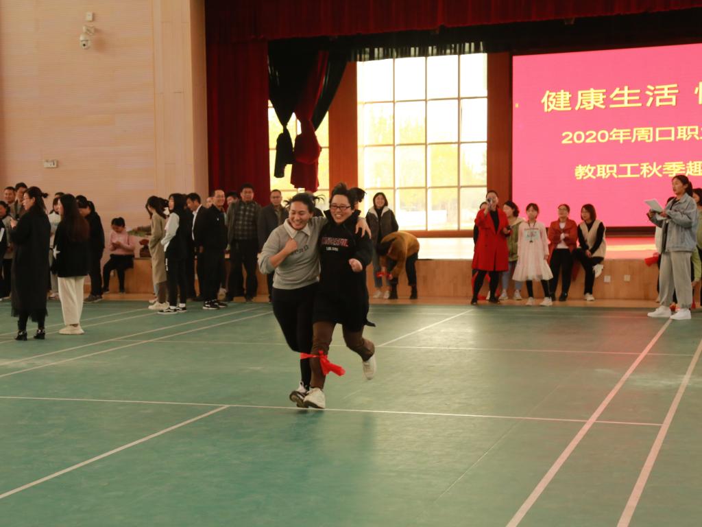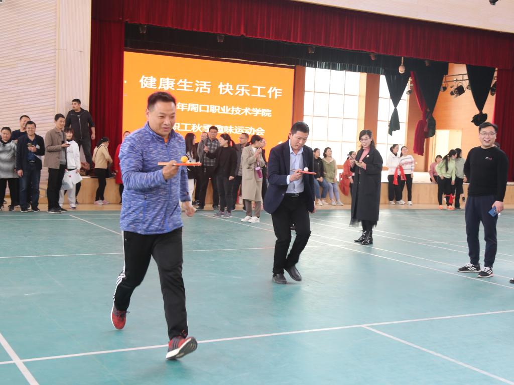 为活跃校园文化氛围,加强教职工之间的交流,激发教职工体育锻炼意识,丰富教职工的业余生活,增强学校凝聚力,11月13日下午,以“健康生活 快乐工作”为主题的周口职业技术学院秋季教职工趣味运动会在校体育馆举行。校纪委书记唐永斌出席开幕式。本次运动会由校工会主办,体育学院承办,各分会推选出的118名教职工参加,共设两人三足跑、托乒乓球接力跑、背对背夹球跑三个趣味比赛项目。运动会由校工会副主席李东营主持。