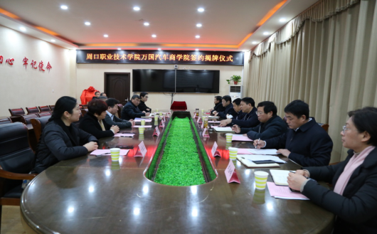 12月30日,周口职业技术学院万国汽车商学院签约揭牌仪式在周口职业技术学院开元校区举行。周口职业技术学院党委书记刘士欣、校长李清臣、副校长许永安和相关部门负责人,河南万国车世界董事长吕辉、河南万国运营管理有限公司副总经理邝金生、行政副总经理朱永兴、财务总监吕雪玲参加了签约揭牌仪式。