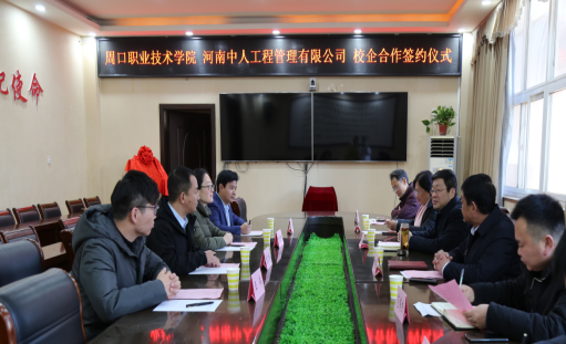 12月30日,周口职业技术学院、河南中人工程管理有限公司校企合作签约揭牌仪式在周口职业技术学院开元校区举行。副校长许永安、教务处长付晓东、招生就业处长武金娟、建筑工程学院党总支书记范伟杰、建筑工程学院院长薛洪和相关人员,中建教育集团总经理衡晓娜、河南中人工程管理有限公司总经理董文林、河南中人工程管理有限公司的校企合作部经理路洋、人力资源经理王伟共同参加了仪式。