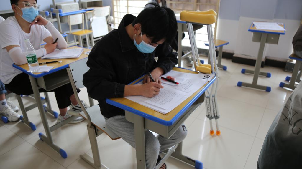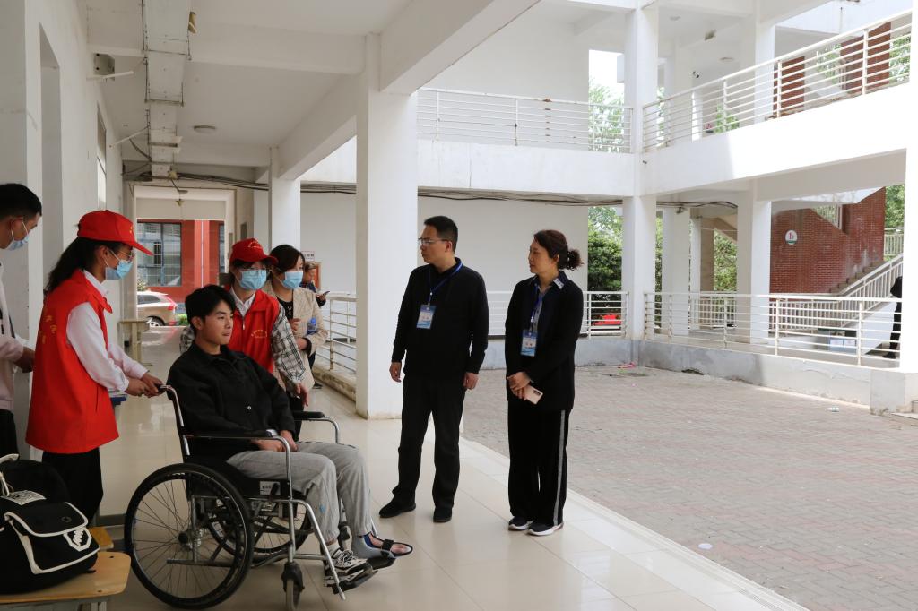 4月18日上午,我校2021年高职单独招生考试进入第二天。来自商水县的考生李家俊在考试前不慎扭伤导致左脚脚踝骨折,在家人的陪同下李家俊同学坚持参加考试。由于家长不能进入考场,得知情况后,文化教育学院党总支书记唐文杰、院长王隼和志愿者同学一起在上午文化课考试结束后,搀扶着将李家俊同学安全送到等候在楼下的家人那里。下午的技能测试学校专门为其开辟了绿色通道,安排李家俊第一个参加测试。李家俊在顺利完成考试后激动地说:“谢谢周口职业技术学院的老师、同学们,感觉心里特别温暖,期待着九月能在校园里和你们再见!”