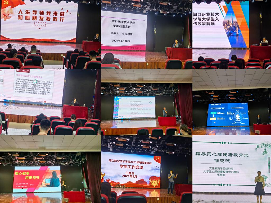 此次培训从新入职辅导员的工作需求角度出发,注重实效、内容贴合实际,学前与艺术教育学院副院长王春生、曾获河南省优秀辅导员称号、文化教育学院学管办主任普俊、文化教育学院辅导员、思政部教管办主任范文婷、文化教育学院辅导员,大学生心理健康教育中心教师张梦柔分别从辅导员职业认知、新时代大学生思想教育、沟通管理、学生安全、大学生心理特点、辅导员工作流程等多个方面展开培训与指导,全面助力2021级辅导员找准角色定位,适应工作岗位,畅通工作思路,提升工作技能。培训过程中,大家认真地就工作中遇到的相关问题进行探讨,活动氛围热烈、互动积极。
