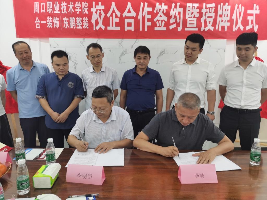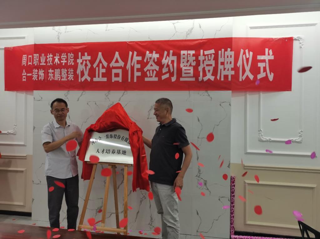 9月16日上午,我校与河南合一装饰股份有限公司校企合作签约挂牌仪式在合一装饰公司总部隆重举行。合一装饰董事长李靖、周口职业技术学院副校长李明臣出席仪式,教务处处长付晓东、建筑工程学院党总支书记范伟杰、院长薛洪等相关负责人参加仪式。仪式由合一装饰总监尹雪情主持。