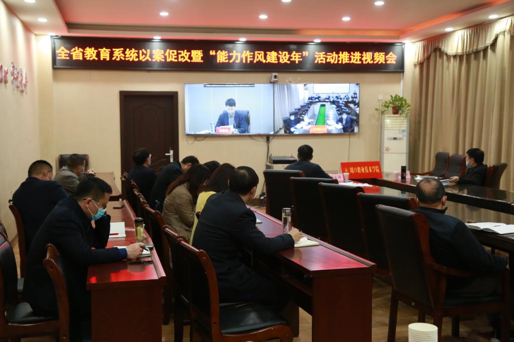 3月11日上午,河南省教育厅召开全省教育系统“以案促改”暨“能力作风建设年”活动推进视频会。省教育厅党组书记、厅长宋争辉,省纪委驻教育厅纪检组长朱俊峰出席会议并讲话。在郑厅领导班子成员、二级巡视员、副总督学、厅机关各处室主要负责同志在郑州主会场参加会议。我校党委书记刘士欣,纪委书记唐永宾,以及组织统战部、宣传部、团委等职能部门负责人以及各院部总支书记、直属支部书记在开元校区第三会议室分会场参加会议。