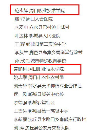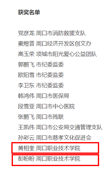 周口职业技术学院黄相奎、彭盼盼、范永辉和袁鹏科四位老师,因其在师德规范、抗疫事迹和社会公益等方面的突出事迹,荣获周口市第一届“道德文明使者”(个人)称号。