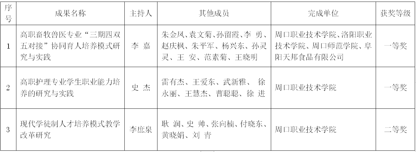日前,河南省教育厅公布了2021年度河南省高等教育教学成果奖(高等职业教育)获奖名单,我校获得一等奖2项,二等奖1项。此次教育教学成果奖的获得,体现了我校在专业建设和教学改革方面的成果。学校将充分发挥省级教学成果奖的示范引领作用,做好成果的推广应用,全面落实立德树人根本任务,深入推进一流专业建设和课程建设,深化产学研相融合,提高教育质量、提升人才培养水平,努力办好人民满意的教育,培养和造就全面发展的社会主义建设者和接班人。