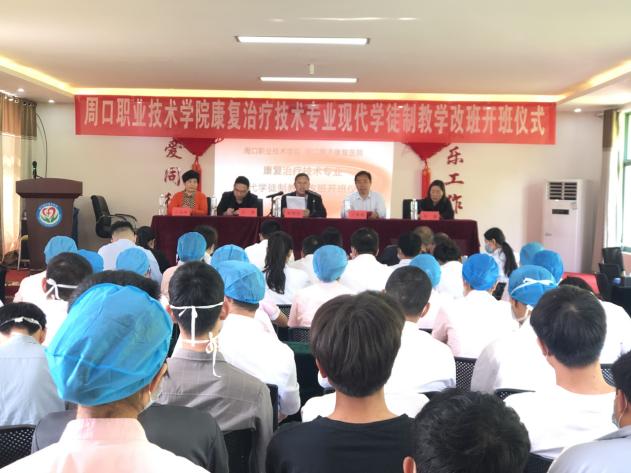 李明臣作讲话,他指出,周口职业技术学院与周口惠济康复医院共同实施的康复治疗技术专业现代学徒制项目,是河南省首批现代学徒制示范点,是双方深化医教融合、推进工学结合、命运与共、携手前行的生动写照,着力培养适应社会需要的高素质康复治疗技术人才。他强调,周口职业技术学院将牢牢坚持“优势互补、互惠互利、专业共建、成果共享”的原则,统筹推进人才培养与社会服务,加快双方全方位、深层次融合,争取在医教协同育人、产业学院共建及卫生健康服务方面走出一条阳光大道,将现代学徒制示范点办出质量,做出成效,成为驰名四方的教育品牌。