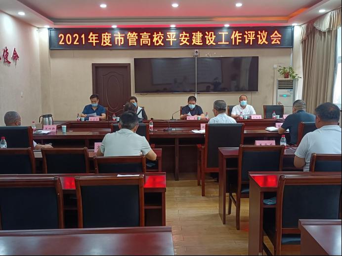 5月31日下午,周口市教育体育局党组成员、副局长朱鑫同志带领“2021年度市管高校平安建设工作评议”考核组一行五人到我校就“平安校园”建设工作进行考核。学校党委副书记赵振然,副校长李秀萍,党政办、保卫处、人事处、学生处、后勤处等部门负责人参加评议会。