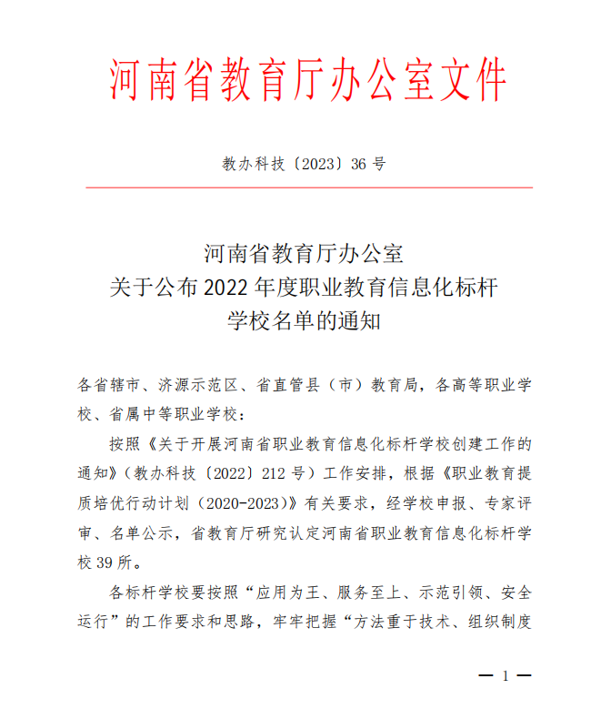 河南省教育厅日前公布2022年度职业教育信息化标杆学校名单,我校获批2022年度河南省职业教育信息化标杆学校。此次共评选出全省39所职业教育信息化标杆学校创建单位,其中高职院校28所,中职学校11所。