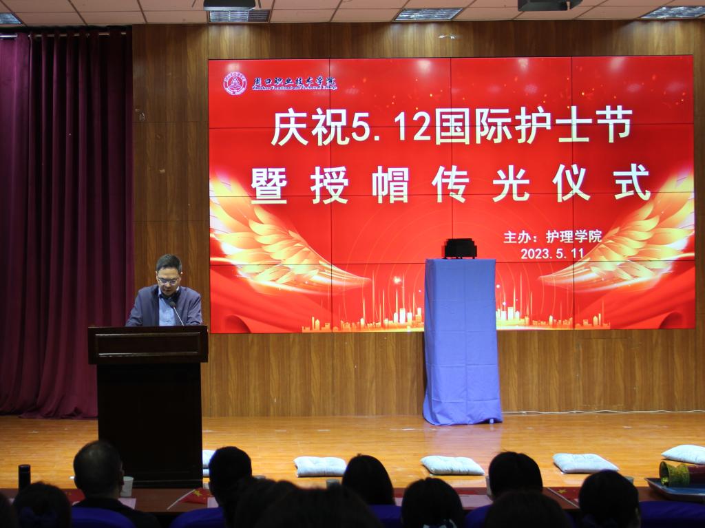为庆祝“5·12”国际护士节,5月11日晚,周口职业技术学院护理学院在文昌校区学术报告厅举行了第112届国际护士节庆祝活动暨授帽传光仪式。副校长王隼,教务处处长李嘉及护理学院、医学院、附属医院等相关部门领导出席,此次活动以线上线下相结合的形式展开。