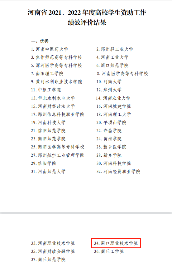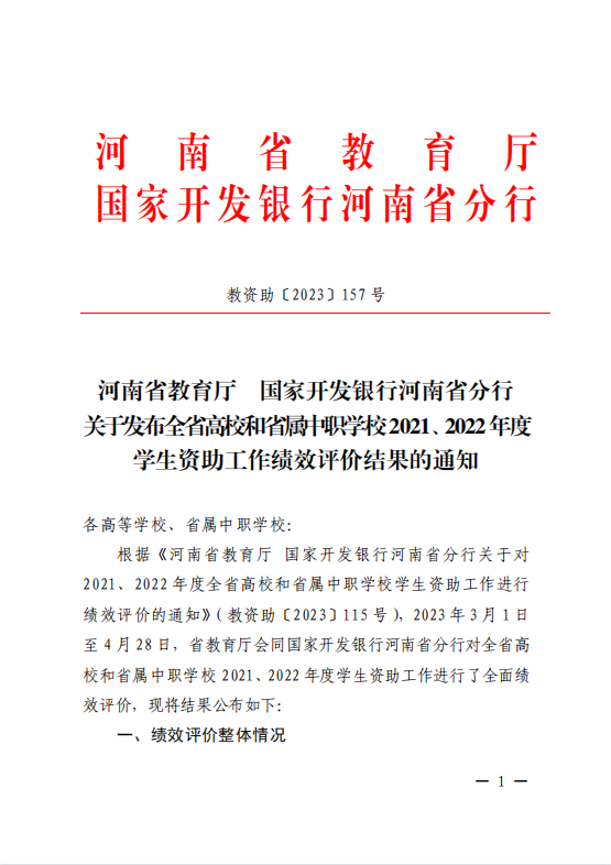 近日,河南省教育厅、国家开发银行河南省分行联合印发了《关于发布全省高校和省属中职学校2021、2022年度学生资助工作绩效评价结果的通知》,我校在此次全省学生资助工作绩效评价中被评为“优秀”等级。