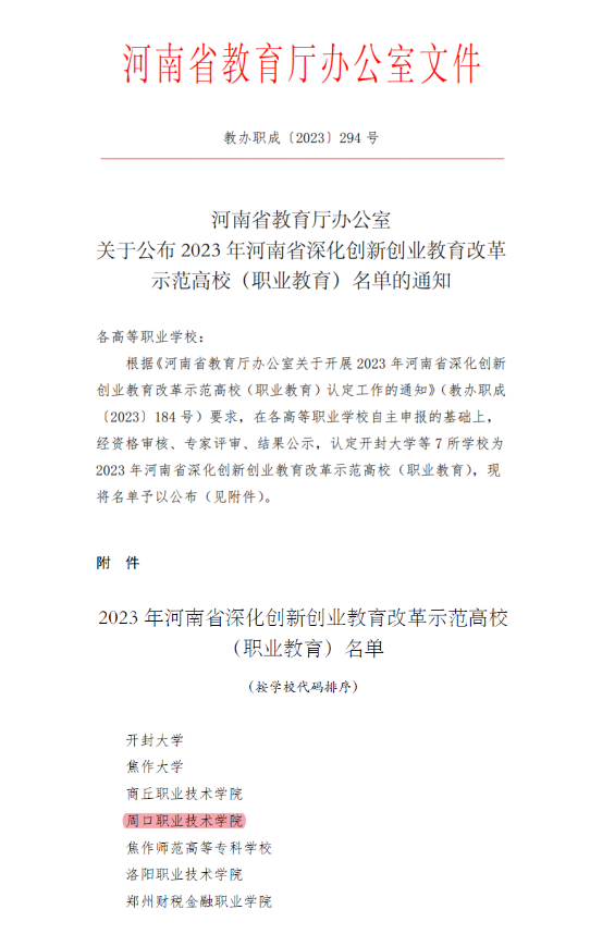 8月21日,河南省教育厅下发《河南省教育厅办公室关于公布2023年河南省深化创新创业教育改革示范高校(职业教育)名单的通知》(教办职成〔2023〕294号),全省共7所高职院校入选,我校位列其中。