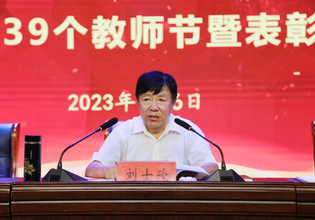 党委书记刘士欣指出,今年教师节的主题是:躬耕教坛,强国有我。他要求,一是要肯定成绩,坚定信心。一年来,在市委市政府的坚强领导和社会各界的大力支持下,在广大教职工的辛勤耕耘和奋力拼搏中,学校招生就业持续向好,教学科研成果显著,干部队伍建设卓有成效,人才强校成效显著,学管工作扎实有效,教职工的幸福感、获得感、安全感持续增强,疫情防控取得决定性胜利。二是要认清形势,踔厉奋发。当前,国家高度重视职业教育,职教政策空前利好,但依然要直面问题。我校正处于弯道超车、提质增效的关键时期,困难与希望同在,挑战与机遇并存。三是要锚定目标,再创辉煌。要旗帜鲜明讲政治,紧扣“培养什么人,怎样培养人,为谁培养人”这一根本问题,努力培养更多德智体美劳全面发展的社会主义建设者和接班人;要一心一意谋发展,加快推进“迁建升本”,加强“双高”校建设,着力建设人才强校;要驰而不息转作风,不断加强三支队伍建设,加强党风廉政建设;要众志成城保平安,确保平安开学、开学平安。