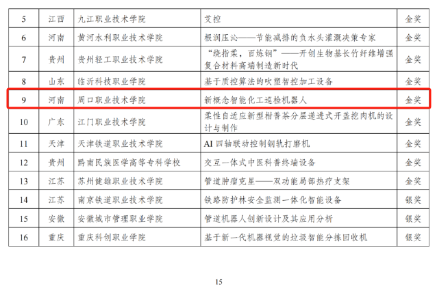 11月9日至11日,第十八届“振兴杯”全国青年职业技能大赛学生组创新创效竞赛全国决赛在郑州举行。经过省赛、全国预选赛多轮角逐,共有来自全国26个省份的241件作品入围全国总决赛,涵盖技术革新、创意设计和管理创新3个竞赛方向。由我校信息工程学院教师张矿伟、轩立指导,学生任俊臣、卜焱等设计的《新概念智能化工巡检机器人》项目在高职组创意设计类赛项中以全国第九名的优异成绩荣获金奖。