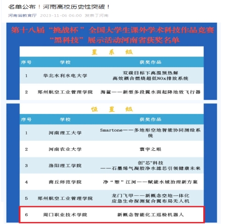 近日,由共青团中央、中国科协、教育部、中国社科院、全国学联主办的第十八届“挑战杯”全国大学生课外学术科技作品竞赛“黑科技”专项赛的终审决赛落下帷幕,经过资格审查、省级复审、国赛评委会综合审定等一系列环节的激烈角逐,我校由信息工程学院张矿伟、轩立两位老师指导,任俊臣、卜焱等同学设计的《新概念智能化工巡检机器人》项目脱颖而出,在国赛中荣获“恒星级”奖项(全国一等奖),实现我校在“挑战杯”系列赛事中的历史性突破。据悉,河南省共有六所高校在“黑科技”专项赛中荣获国赛一等奖,我校是其中唯一一所专科院校。