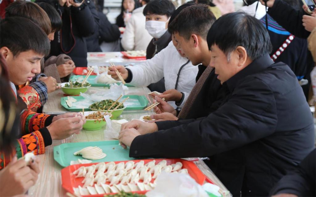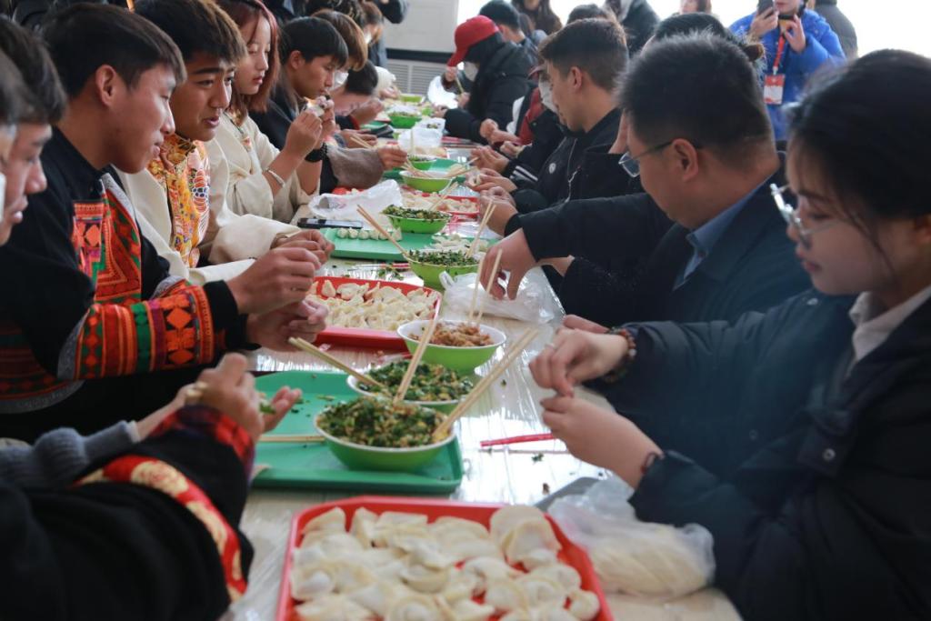 活动现场,摆放着用心准备的馅料、饺皮等材料,各民族师生欢聚在一起,热情高涨,纷纷捋起袖子,各显身手,包起饺子。校领导也在百忙之中加入到包饺子队伍中,和同学们亲切交流,畅谈日常,欢声笑语凝结成冬日里最温暖的祝福。