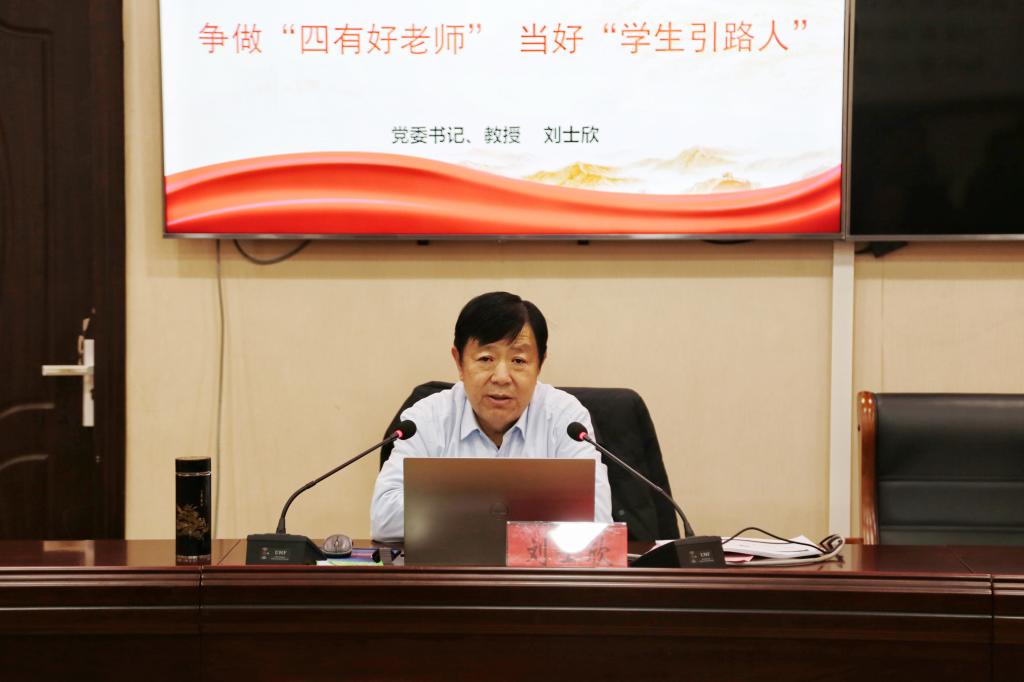 刘士欣代表全体教职工对新聘教师的加入表示热烈欢迎,并以《争做“四有好老师” 当好“学生引路人”》为题作专题讲座。他首先就学校办学历史和基本情况作详细介绍,并结合自身工作实际,围绕“对标四有好老师”“学高为师 身正为范”等内容,用一个个鲜活生动的事例,引导新聘教师要聚焦根本任务、提升综合素质、厚植爱生情怀,勉励大家争做有理想信念、有道德情操、有扎实学识、有仁爱之心的“四有好老师”。