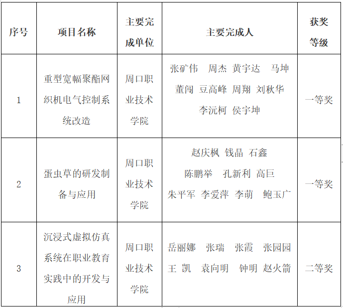 根据《周口市人民政府关于印发周口市科学技术进步奖奖励办法》(周政〔2011〕99号),经周口市科学技术进步奖评审委员会评审,决定授予张矿伟、赵庆枫项目团队2023年度周口市科学技术进步奖一等奖,授予岳丽娜项目团队2023年度周口市科学技术进步奖二等奖。