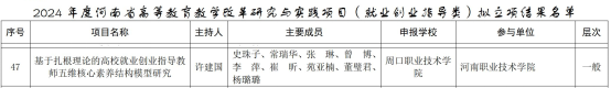 近日,河南省教育厅发布了《关于公布2024年度河南省高等教育教学改革研究与实践项目的拟立项项目名单》,我校6个项目获批立项。其中,高等职业教育类5项、就业创业指导类1项。