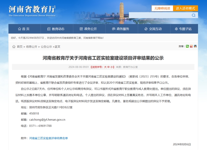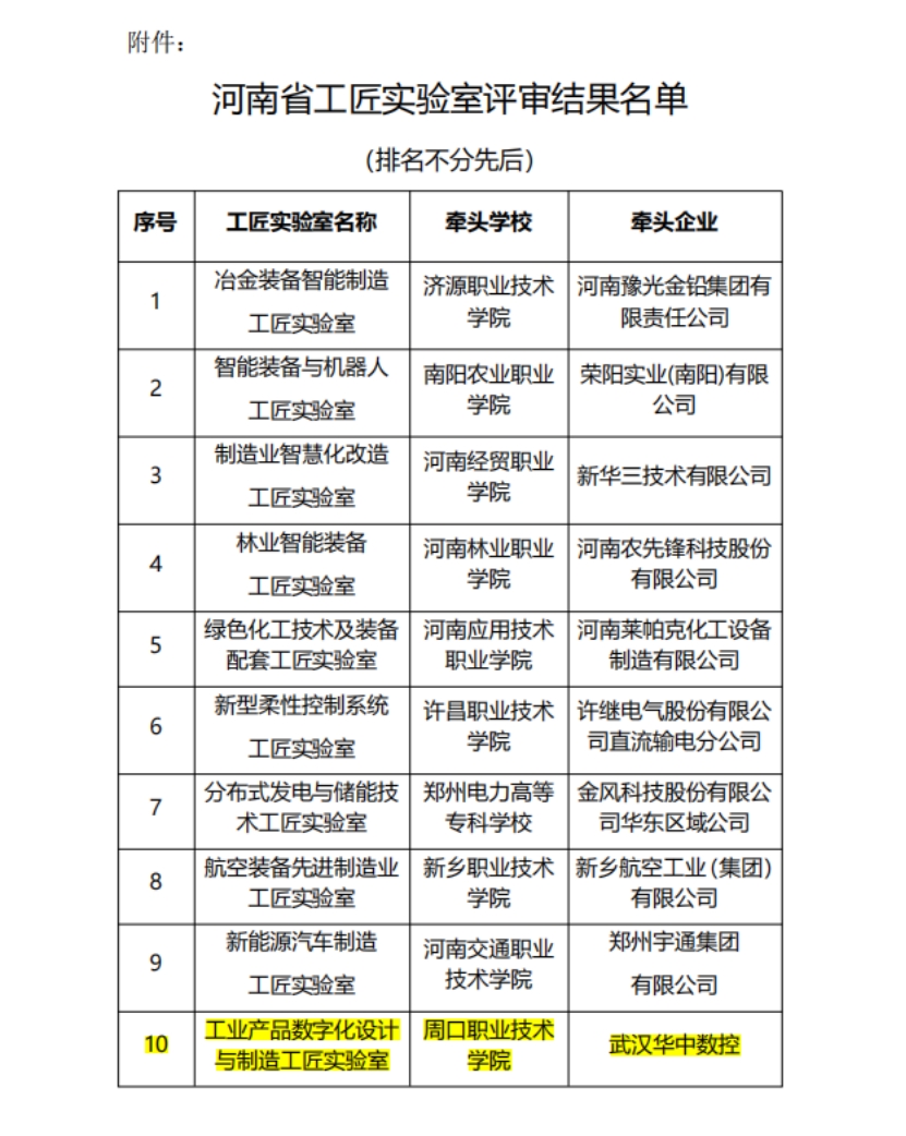 近日,河南省教育厅办公室发布了《河南省教育厅关于河南省工匠实验室建设项目评审结果的公示》,我校工业产品数字化设计与制造实验室获批为河南省工匠实验室。