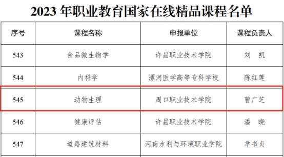 12月9日,教育部公示了2023年职业教育国家在线精品课程名单,我校曹广芝教授主持的《动物生理》课程成功入选,这是学校课程建设改革取得的又一标志性成果。