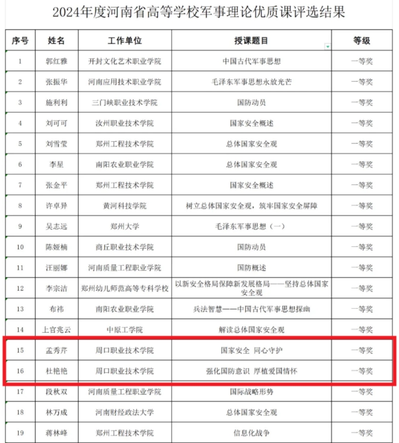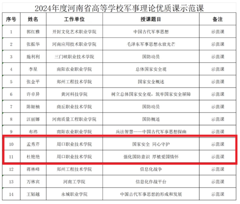 12月13日,河南省教育厅、河南省军区战备建设局关于2024年度全省高等学校军事理论优质课评选活动比赛结果公示。我校马克思主义学院教师孟秀芹、杜艳艳荣获全省军事理论优质课比赛一等奖,所申报课程入选2024年度河南省高等学校军事理论优质课示范课。