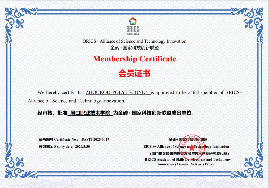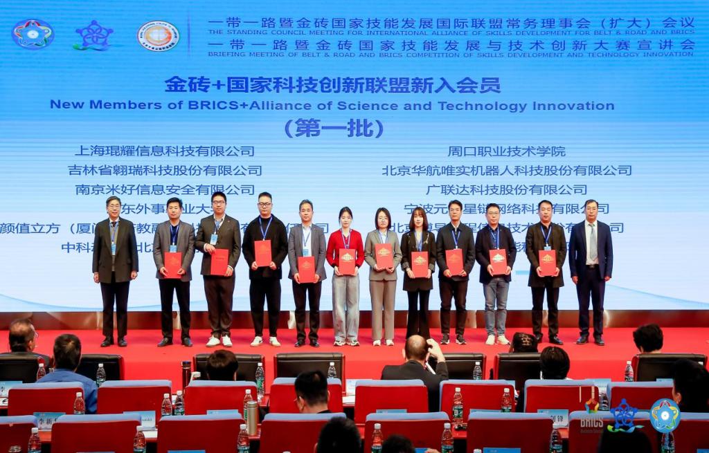 依托近年来在“一带一路”金砖国家系列赛事获得的突出成绩,经信息工程学院申报,组委会严格审核把关,我校自去年入选“一带一路”暨金砖国家技能发展国际联盟会员单位以来,今年再次成功入选新成立的“金砖+”国家科技创新联盟成员单位,“一带一路”暨金砖国家技能发展国际联盟理事长刘振英博士为首批入选的全国35家“金砖+”国家科技创新联盟成员单位代表现场颁发会员证书。