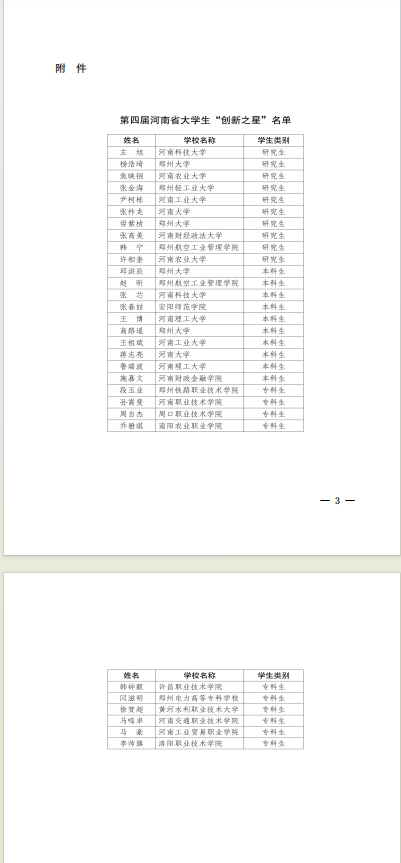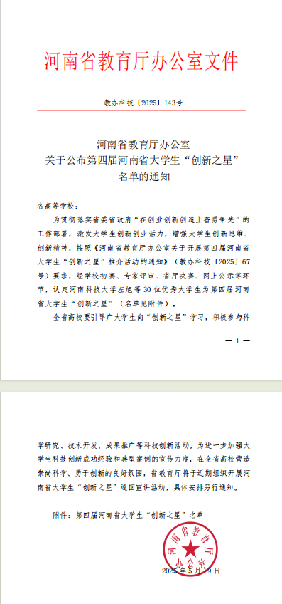 近日,由省教育厅组织开展的第四届河南省大学生“创新之星”评选结果公布。经学校推荐、专家评审、现场决赛等环节,我校2023级计算机网络技术专业学生周自杰获第四届河南省大学生“创新之星”荣誉称号,全省高职院校仅10名大学生入选,这也是我校连续四年获此荣誉,充分彰显了我校创新创业人才培养水平和教育教学成果。