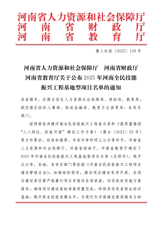 近日,河南省人力资源和社会保障厅、河南省财政厅、河南省教育厅公布2025年河南全民技能振兴工程基地型项目名单的通知,我校张昭晗省级技能大师工作室成功入选,这是继2024年位东丽养老护理员省级技能大师工作室后获批的又一成果。