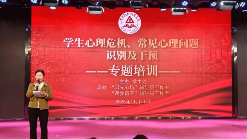 为进一步提升辅导员队伍心理健康教育专业素养,强化学生心理危机预警与干预能力,筑牢校园心理健康安全防线,11月11日下午,我校在开元校区艺术演播厅举办“学生心理危机、常见心理问题识别及干预”专题培训。活动特邀心理健康教育专家刘海燕主讲,副校长李秀萍出席。各二级学院(部)党总支书记、学管副院长、学管办主任,全体在校生辅导员及学生处、心理指导中心相关工作人员参加。学生处副处长王换换主持。