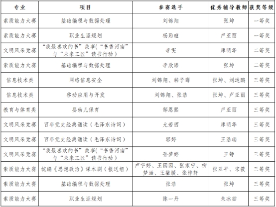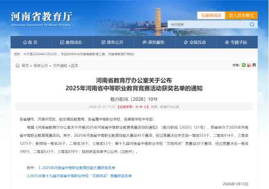 近日,河南省教育厅公布2025年河南省中等职业教育竞赛活动获奖名单,我校学子共斩获13个奖项,创下佳绩。其中,一等奖2项、二等奖2项、三等奖9项。