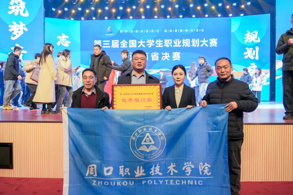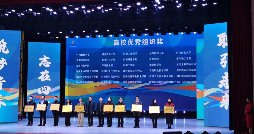 1月28日上午,第三届全国大学生职业规划大赛河南省赛颁奖仪式在洛阳师范学院音乐大厅举行。我校师生再创佳绩,共斩获金奖1项、银奖1项、铜奖3项,学校被授予“优秀组织奖”。