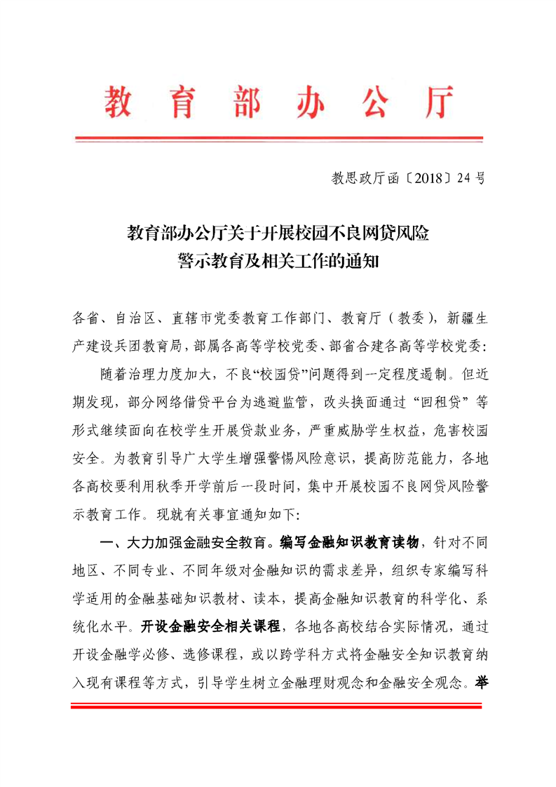 教育部办公厅关于开展校园不良网贷风险警示教育及相关工作的通知