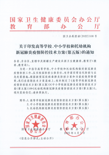 关于印发高等学校、中小学校和托幼机构新冠肺炎疫情防控技术方案(第五版)的通知