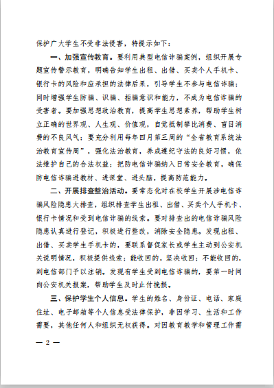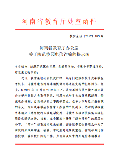 河南省教育厅办公室关于防范校园电信诈骗的提示函