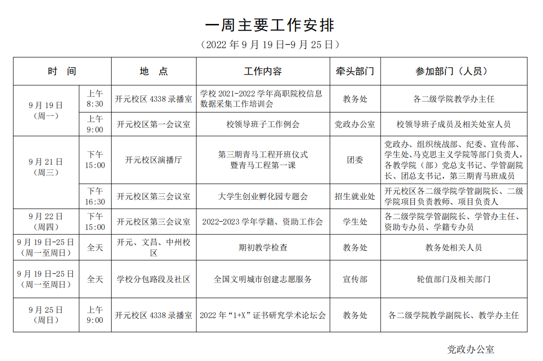 一周主要工作安排(2022年9月19日-9月25日)