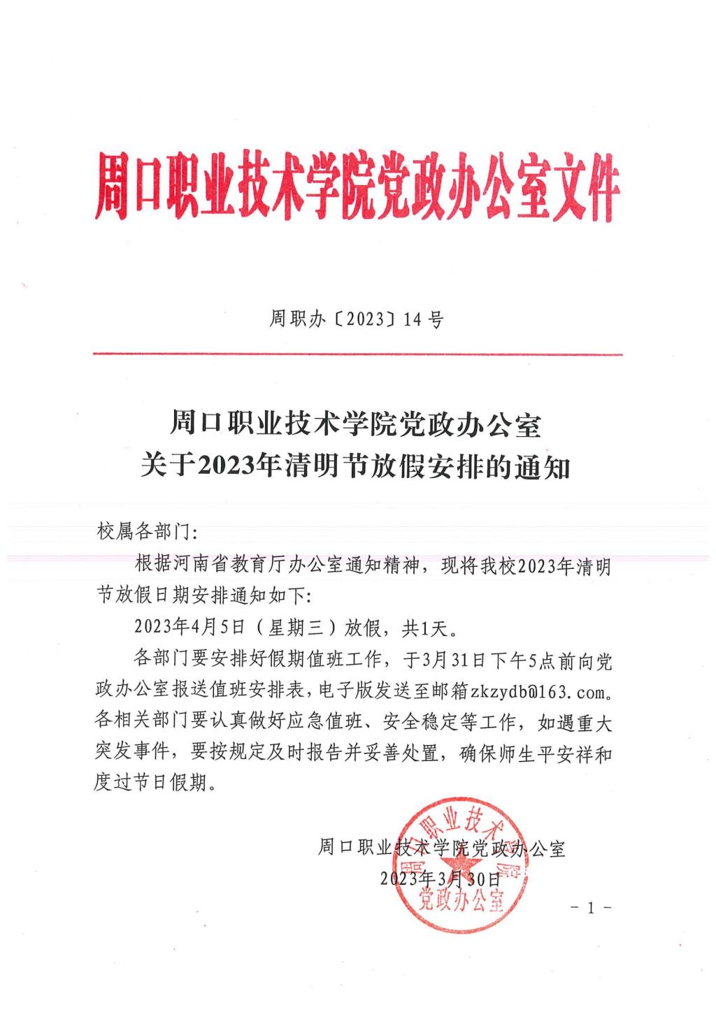 周口职业技术学院党政办公室关于2023年清明节放假安排的通知