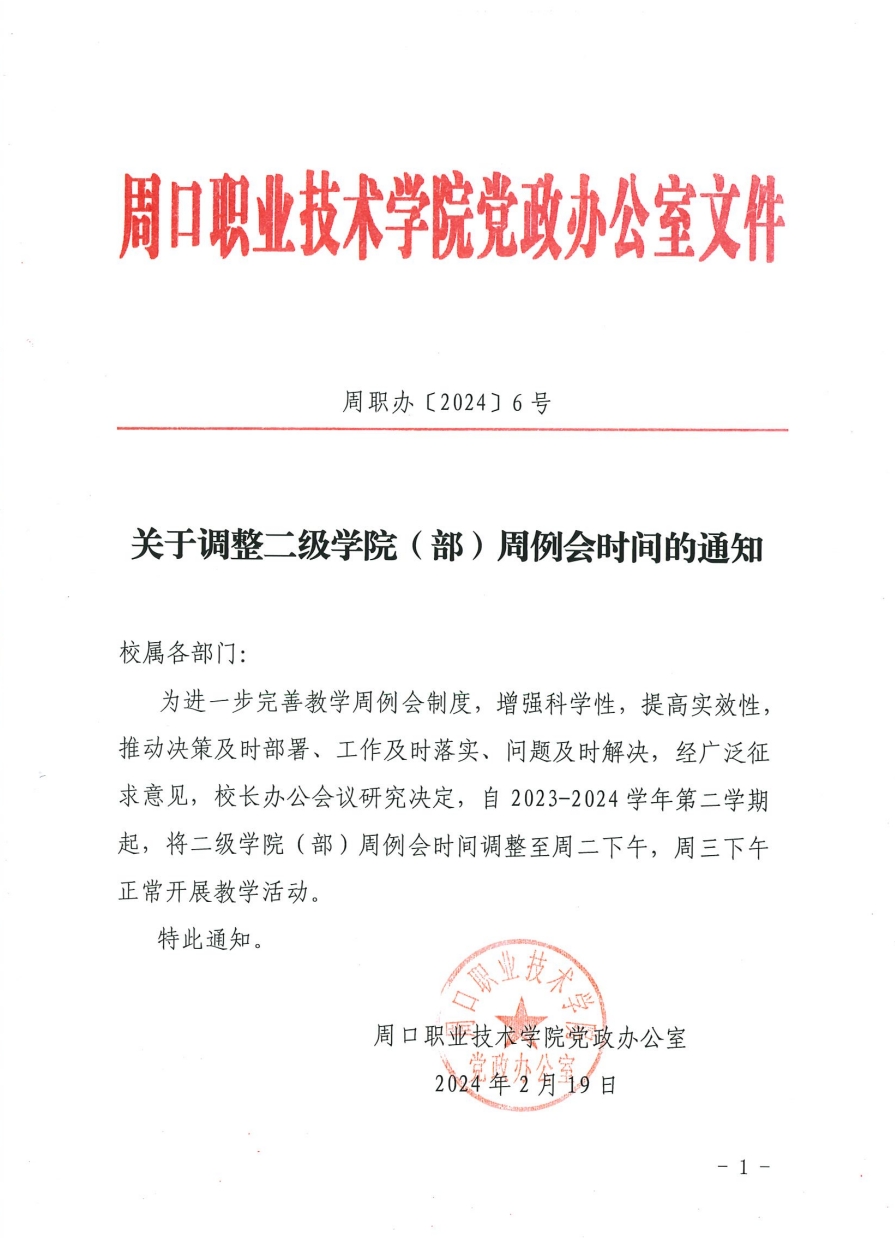 周口职业技术学院关于调整二级学院(部)周例会时间的通知