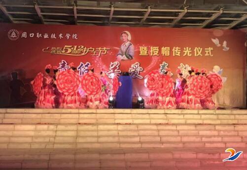 仪式在周口职业技术学院医学院教师表演的舞蹈《盛世花开》中拉开帷幕。洁白的燕尾帽象征着圣洁的天使,燃烧的蜡烛象征着“燃烧自己,照亮他人”的崇高精神。