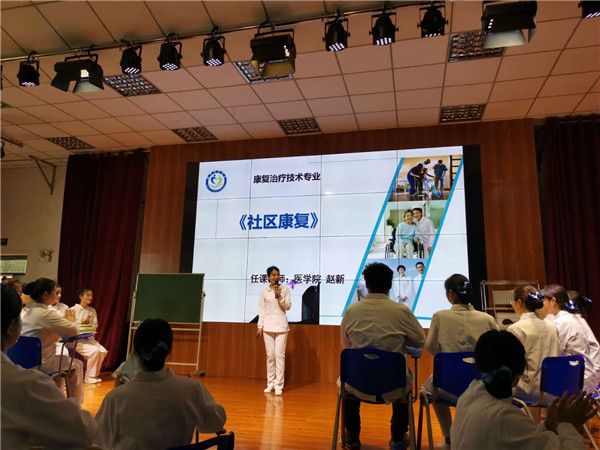 会议第一阶段,与会领导和教师观摩医学院赵欣老师主讲的《颈椎病的健康教育》公开课。教务处长付晓东作了点评。