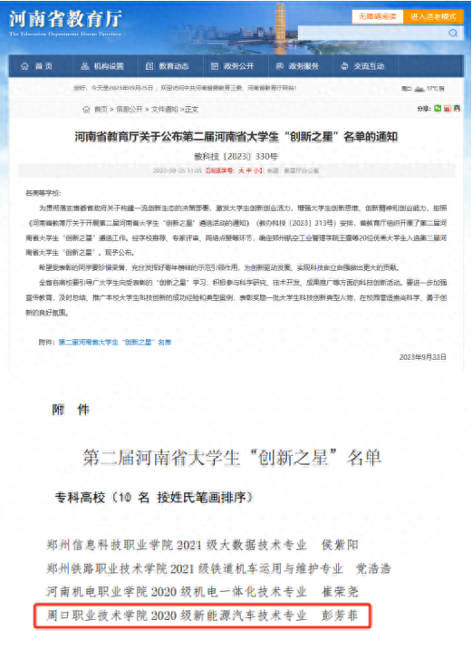 9月22日,河南省教育厅公布了第二届河南省大学生“创新之星”名单,此次共评选出年度大学生“创新之星”20名。经过二级学院(部)推荐、学校推荐、专家评审、网络点赞、公示等环节,周口职业技术学院汽车与机电工程学院新能源汽车技术专业2023届毕业生彭芳菲荣获第二届河南省大学生“创新之星”荣誉称号,这是周口职业技术学院学子连续两届获此殊荣。