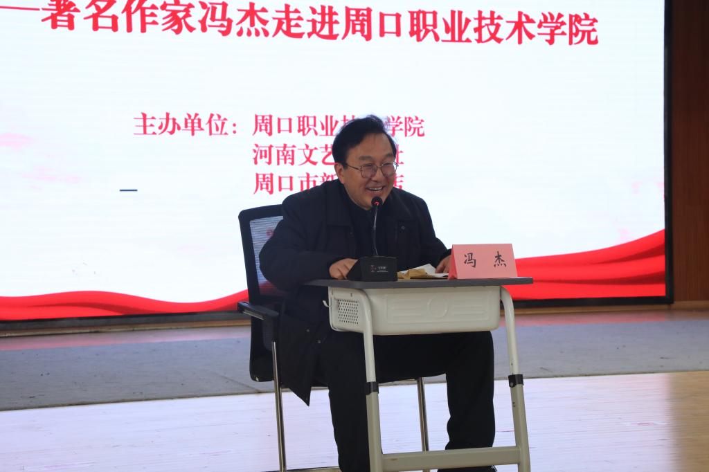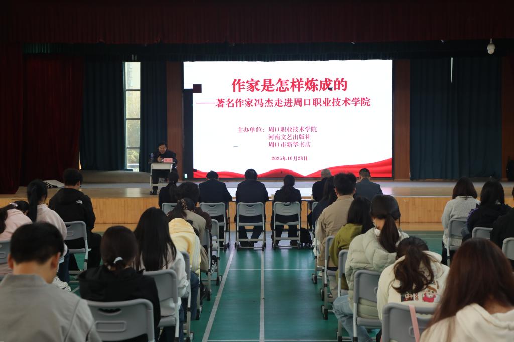 10月28日下午,由周口职业技术学院、河南文艺出版社、周口市新华书店联合主办的“作家是怎样炼成的”主题讲座在开元校区体育馆举行。特邀著名作家冯杰先生担任主讲嘉宾,为现场200余名师生带来一场关于阅读与成长的文学盛宴。