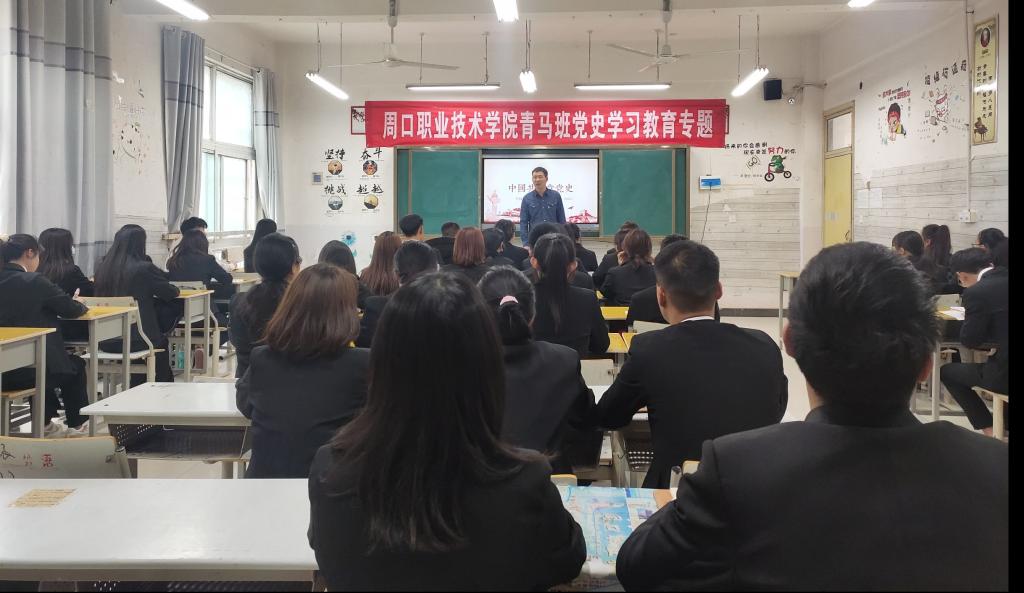 2021年4月13日下午,周口职业技术学院青马班开展党史学习教育专题学习。文化教育学院团总支书记、青马班班主任普俊围绕“百年党史”展开主题分享。