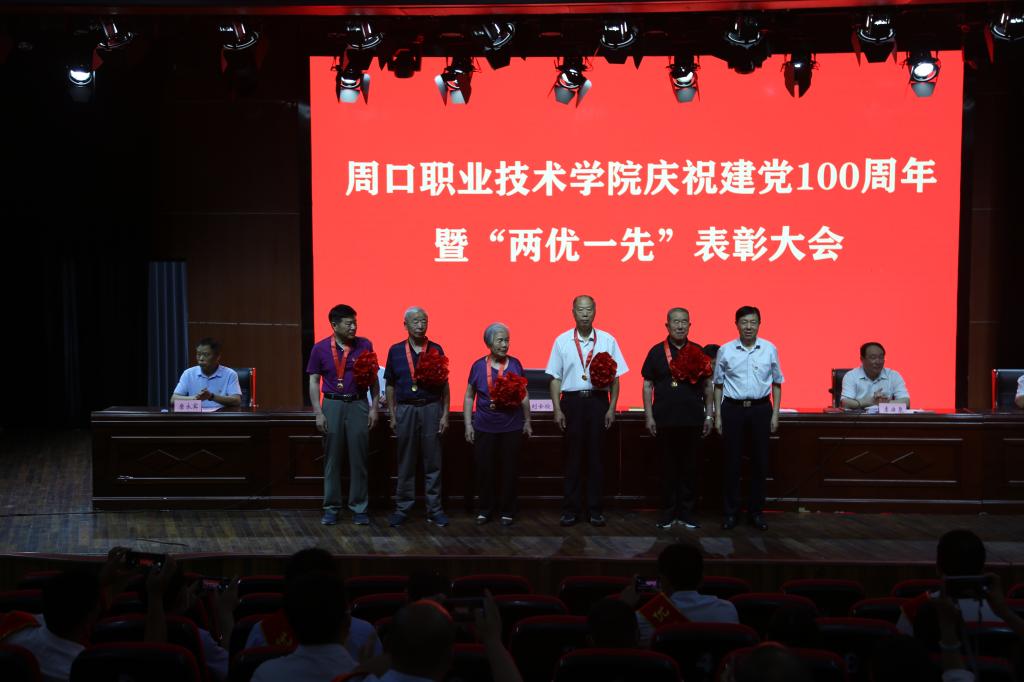 党委书记刘士欣为“光荣在党50年”党员代表颁发纪念章。校领导班子成员为学校受表彰的“两优一先”代表颁奖。