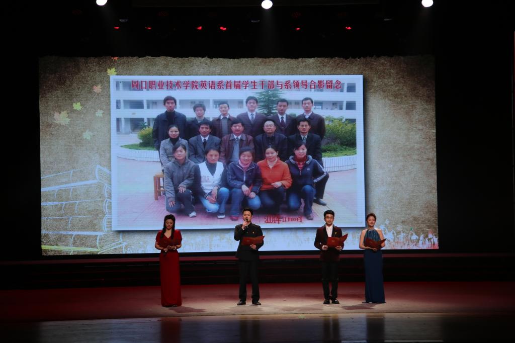 伴随着学前与艺术教育学院正青春舞蹈队表演的舞蹈《盛世花开》,晚会拉开序幕。配乐诗朗诵《浴火重生》在娓娓道来中演绎了学校的建立和发展历程,随着背景上一幅幅历史画卷的展开,重现了学校发展的峥嵘岁月。女生小合唱《职业教育未来的希望》唱响了职业教育的未来!情景合唱《众人划桨开大船》唱出了道出了周职人团结奋进,人人挺举,勇往直前的信心。歌伴舞《爱在天地间》诠释了我校优秀学子传承和践行着我们周职人的大爱精神,他们用自己生命书写着天地间的人间大爱。舞蹈《奋进》让我们看到了代代周职人心手相连,破茧成蝶的茁壮成长,尽情挥洒喜悦和激情。歌伴舞《我的深情为你守候》是对各级领导、社会各界人士、学校历任领导、各级校友以及优秀毕业生的感谢,感谢他们的不离不弃,感谢他们的深情守候。以周口职业技术学院教师吕月桂为原型创作改编的戏曲短剧《无名花》将以吕月桂老师为代表的老教师们无私奉献,甘为人梯的精神展现的淋漓尽致。表演结束后,校长李清臣教授亲自为吕月桂老师颁发返聘聘书。音乐起,《老师我想你》悠扬清新的歌唱诉说了学生对老师的敬爱之情,表达了校友对母校、老师始终充满的深深思念。戏曲《梨园情》体现出了周职学子们用勤奋践行着“砺德砺能,志存高远”的校训,用苦练继承了“求真理、存良知、有技能、敢担当”的学风。歌伴舞《校园晨曲》演奏着周职学子的勤奋和欢乐,也记录了周职的成长历程。晚会在《托起明天的辉煌》雄浑厚重、铿锵有力的歌声中落下帷幕。
